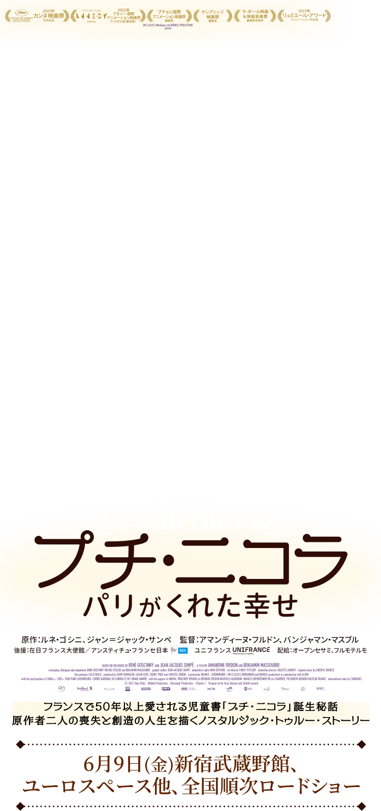 パリの街並みを望む小さなアトリエ。イラストレーターのサンペと作家のゴシニは、いたずら好きの男の子のキャラクター、ニコラに命を吹き込んでいた。大好きなママのおやつ、校庭での仲間達との喧嘩、先生お手上げの臨海学校の大騒ぎ・・・。ニコラを描きながら、望んでも得られなかった幸せな子供時代を追体験していくサンペ。また、ある悲劇を胸に秘めるゴシニは、物語に最高の楽しさを与えていった。児童書「プチ・ニコラ」の心躍らせる世界を創造しながら、激動の人生を思う二人。ニコラの存在は、そんな彼らの友情を永遠のものにしていく・・・。